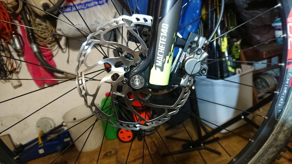 abra Opublikowano 16 Grudnia 2020 Opublikowano 16 Grudnia 2020 Zamontowałem. Trochę zadowolenia, trochę kwasu. Niestety pod hamulec Tektro adapter shimano do tarczy 203 nie pasuje idealnie. przedni adapter Tektro przełożony razem z tarczą 180 na tył też nie pasuje idealnie. Ale dużo nie brakowało, więc coś dokombinowałem. Mała prowizorka, która może długo przetrwać 😁. Ale nowa tarcza 203mm wygląda imponująco. Musiałem spreparować dodatkowe dystanse, bo klocki były zbyt nisko i dociskały obie tarcze na mniejszym promieniu niż powinny. Czyli przesunięte były do środka osi tarczy jakieś kilka % swojej powierzchni. Z aluminium wylaubzegowałem dystanse, które przesunęły zaciski i klocki w prawidłowe położenie. Test działania był krótki, bo ciemno, mróz złapał, a marnie ubrany zacząłem szczękać zębami szybciej niż mi się wydawało. Pełnię odkryję podczas pełnego rejsu po górach a nie takie pitu pitu pod garażem. No i może coś wykombinuję mądrzejszego niż te dodatkowe aluminiowe dystanse.