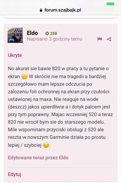 Eldo Opublikowano 10 Grudnia 2018 Opublikowano 10 Grudnia 2018 (edytowane) No akurat sie bawie 820 w pracy a tu pytanie o ekran 🙃 W skrócie nie ma tragedii a bardziej szczegółowo mam lepsze odczucia po zalozeniu foli ochronnej na ekran przy czułości ustawionej na maxa. Nie reaguje na wode (deszcz) jakos upierdliwie a i dotyk palcem jest przy tym poprawny. Majac wczesniej 520 a teraz 820 nie wrocił bym sie do starszego modelu. Mile wspominam przyciski obsługi z 520 ale reszta w nowszym Garminie działa po prostu lepiej / szybciej 😏 Edytowane 10 Grudnia 2018 przez Eldo
