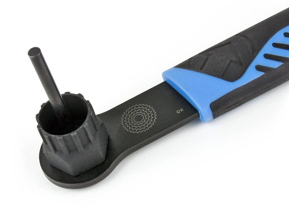 2. W tylnym kole naszego przykładowego roweru oś przelotowa ma 12 mm średnicy, więc zmieści się tam inna nakrętka i klucz (a mogli użyć w rowerach tej samej, co z przodu...). Klucz ten sam, co do kaset.