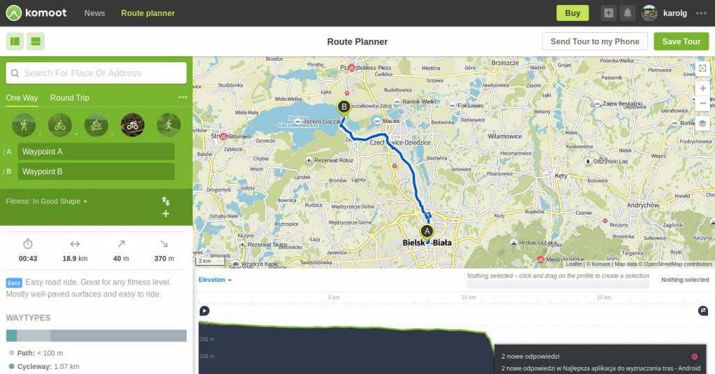 nctrns Opublikowano 26 Sierpnia 2019 Opublikowano 26 Sierpnia 2019 (edytowane) Na tym który jest za free przy rejestracji powinno ogarnąć. EDIT: Zrobiłem czterema kliknięciami trasę Bielsko-Pszczyna-Zebrzydowice-Bielsko, potem podobnie w RWGPS i zgłosiłem to w supprocie Komoot. Edytowane 26 Sierpnia 2019 przez nctrns