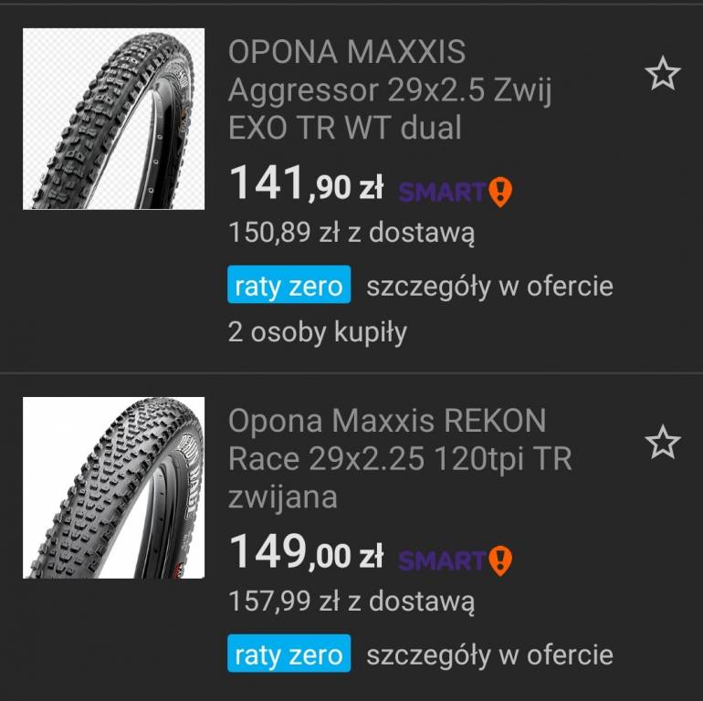 TomekCorsa Opublikowano 16 Lipca 2020 Opublikowano 16 Lipca 2020 (edytowane) https://allegro.pl/oferta/opona-maxxis-aggressor-29x2-5-zwij-exo-tr-wt-dual-7955010083?utm_medium=app_share&utm_source=facebook To jest opona. Przód i tył na foto. Edytowane 16 Lipca 2020 przez TomekCorsa