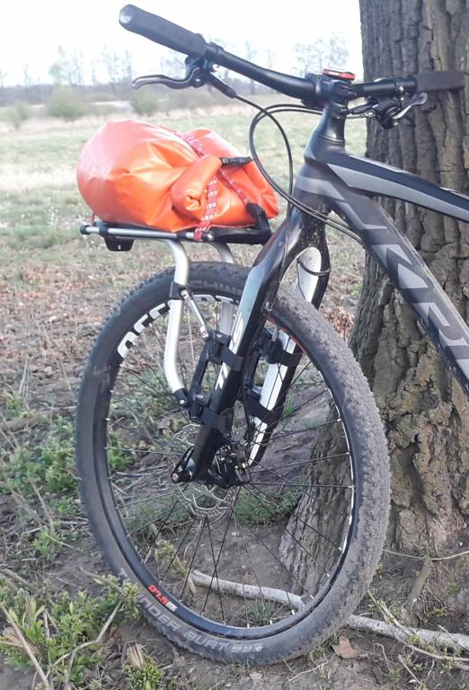 Jeżeli masz otwory montażowe w połowie długości widelca po jego zewnętrzenej stronie i dodatkowy otwór w górnej części widelca zaraz nad oponą to można takie coś zamontować. Jeżeli nie masz tych otworów to pozostaje tylko bagażnik od firmy THULE Tour Rack który testowałem na widelcu karbonowym.