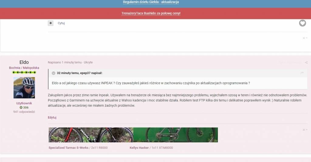 epep37 Opublikowano 4 Maja 2019 Opublikowano 4 Maja 2019 Juni0R0011 Bardzo dziękuje za odpowiedź. Jeszcze pytanko o ogólne wrażenia tego czujnika ? Wszystko działa nie gubi sygnału, wykresy mocy beż żadnych zwariowanych pików itp ? Wysyłałeś swoje ramie korby czy wersję gotową ? Jestem właśnie bardzo ciekaw odpowiedzi INPEAK na recenzje GPLamy również na czekam. Na recenzji widać było ze moc śledzi ładnie ale duża różnica w watach była. Pozdrawiam, Piotr