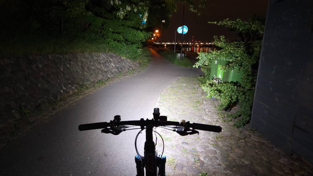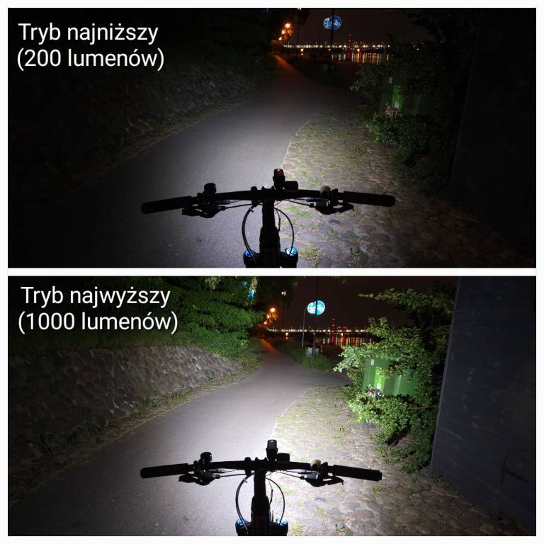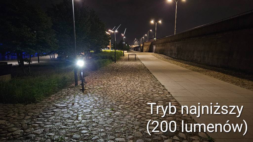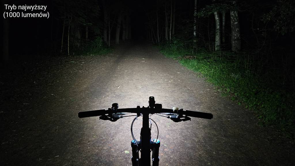 filipog44 Opublikowano 8 Sierpnia 2023 Opublikowano 8 Sierpnia 2023 Przeczytałem wątek w całości i dziękuję za dużą ilość opinii ze zdjęciami Postanowiłem podzielić się swoją na temat: Mactronic HighLine https://mactronic.pl/produkt/przednia-lampa-rowerowa-wysokiej-mocy-1000-lm-usb-c-highline/ Po wyjęciu z pudełka, robi dobre wrażenie, jest solidnie wykonana. Lampa jest w całości aluminiowa, a jej elementy są wzorowo dopasowane. Nic się nie ugina ani nie trzeszczy. W mojej opinii, ma bardzo dobry rozkład światła - na środku nie ma okrągłego punktu skupienia światła - droga jest równomiernie oświetlona. Delikatne skupienie światła występuje w miejscu najbardziej oddalonym od koła, ale nie ma postaci okrągłej kropki, a raczej poziomej kreski. Dzięki temu, po ustawieniu odpowiedniego nachylenia, droga jest niemal jednolicie oświetlona. Świeci szeroko, pięknie doświetla zakręty i jest mało wrażliwa na ruchy kierownicą. Z powodu dużego rozproszenia światła na boki, lampa nie ma może rekordowo dużego zasięgu, jednak w moim przypadku jest on wystarczający. W moim odczuciu, jazda z tą lampą jest wyjątkowo przyjemna, zarówno po mieście jak i nieoświetlonych drogach czy terenie. Nie ma tutaj soczewki z odcięciem, za to lampka jest wyposażona w kolimator, minimalizujący oślepianie, choć ma to zastosowanie raczej tylko w najniższym trybie 200 lumenów. W średnim (400 lm) i wysokim (1000 lm) trybie lampa świeci na tyle mocno, że potrafi oślepiać. Soczewka ma głębokie nacięcia, kierujące światło w dół i również jest świetnie spasowana, a dodatkowo przysłonięta od góry, aby światło nie raziło rowerzysty, jednocześnie odsłonięta po bokach, co zapewnia widoczność z boku i ładnie wygląda. Najniższy tryb 200 lumenów jest uniwersalny i dobrze sprawdza się zarówno podczas jazdy po oświetlonym mieście, jak i w ciemnych uliczkach. Kolejną zaletą jest funkcja pamięci - lampka zawsze włącza się w ostatnio używanym trybie, zatem nie trzeba ich przełączać przy każdym uruchomieniu. Mocowanie do kierownicy bez zastrzeżeń - proste i stabilne. Jest też możliwość montażu pod kierownicą, po przełożeniu uchwytu na górną część lampki. Dodam jeszcze, że nachylenie można wygodnie zmieniać / korygować w trakcie jazdy w ciągu jednej sekundy (np. zmieniając tryb z niskiego na mocny) poprzez podniesienie lampki do góry bez konieczności luzowania śruby (bo środek ciężkości jest w takim miejscu, że lampka nie zmienia swojego położenia na nierównościach, ale można ją nadal pochylać ręką). Wady: mały akumulator 2600 mAh, który (w najniższym trybie 200 lumenów) wystarcza na 6 godzin świecenia i półtorej godziny w najwyższym trybie 1000 lumenów. Moim zdaniem, to krótki czas, wymuszający dość częste ładowanie. Lampa mogłaby być większa, ale mieć bardziej pojemny akumulator. Drugą wadą jest brak wskaźnika wybranego trybu świecenia oraz brak dokładnego wskaźnika naładowania akumulatora. Wyruszając na przejażdżkę, nie można mieć pewności, ile dokładnie energii pozostało. Jest tylko sygnalizacja niskiego poziomu naładowania (przy 30% baterii kontrolka zaczyna migać, a przy 10% zmienia kolor na czerwony). Zdecydowanie lepszy byłby precyzyjny wskaźnik np. z 5 kropek, tak jak np. w lampce Sigma Buster 1100. Trzecią wadą jest wolne ładowanie, trwające aż 4 godziny. Ogółem lampa jest naprawdę dobra, chyba najlepsza z jaką miałem styczność, ale mogłaby mieć trochę większy akumulator i wskaźniki naładowania / wybranego trybu świecenia. Zauważyłem, że lampki z odcięciem, nie oślepiają osób z naprzeciwka, ale zazwyczaj słabo doświetlają boki / drogę w zakrętach, a ponadto światło nie zawsze jest równomiernie rozproszone. W przypadku Mactronic Highline, ten problem nie występuje, za to lampa może w pewnym stopniu oślepiać innych (szczególnie w trybie średnim i wysokim). A co Wy o niej sądzicie? Czy kolimator to dobry kompromis pomiędzy równomiernym oświetleniem drogi i minimalizowaniem oślepiania innych? W dniu 26.02.2023 o 19:42, Nemrod napisał: Townwild CL1200 Lampka Townwilda. Sama jakość wykonania jest bez zarzutu. Nie ma się czego wstydzić przy jakiejkolwiek lampce. Obudowa jest metalowa, za rozkład światła odpowiada kolimator. Wyposażono ją w ogniowo o pojemności 4000 mha. Jednak w przciwieństwie do CL800 nie jest ono wymienne. Za plus należy uznać port usb-c. Lampkę można obsługiwać za pomocą znajdującego się na niej przycisku jak i bezprzewodowego pilota. Z tym, że włączyć/ wyłączyć można ją tylko przyciskiem znajdującym się na niej. Obsługa jest standardowa dla większości lampek. Dłuższe przytrzymanie odpowiada za włączenie/ wyłączenie. Kliknieciami zmieniamy tryby a dwuklik zmienia je na tryby migające ( pilot ma do tego osobny przycisk). Dzięki dość sprytnie zaprojektowanemu mocowaniu lampkę można zamontować pod jak i nad kierownicą. Również można dokupić wysięgnik który umożliwia jej montaż pod licznikiem. Sam kolimator ma bardziej skomplikowaną budowę niż w modelu cl800. Jak świeci ? A no jak dla mnie średnio. Mocy lampce nie brakuje ale samo odcięcie jest bardziej ograniczeniem oślepiania. Rozkład też jest dość latarkowy. Przy górnej granicy brakuje nieco światła a jest go za dużo niżej przez co zasięg nie imponuje. Da się to skorygować podnosząc wyżej lampkę ale wtedy już daje mocno po oczach osobą z przeciwka. Tak świeci ustawiona tak by nie oślepiać i w maksymalnym trybie: Hmm...lampka jest dość ciężka do oceny. Jest bardzo dobrze wykonana. Ma solidne mocowanie. Przemyślanie dobrane tryby i dobrą obsługę wspomaganą pilotem. Za to są lampki które mają lepszy rozkład światła. No i jak na produkt z Ali jest droga. Czy Mactronic Highline nie jest przypadkiem kopią tej lampki? Wydaje mi się, że na Twoim zdj
