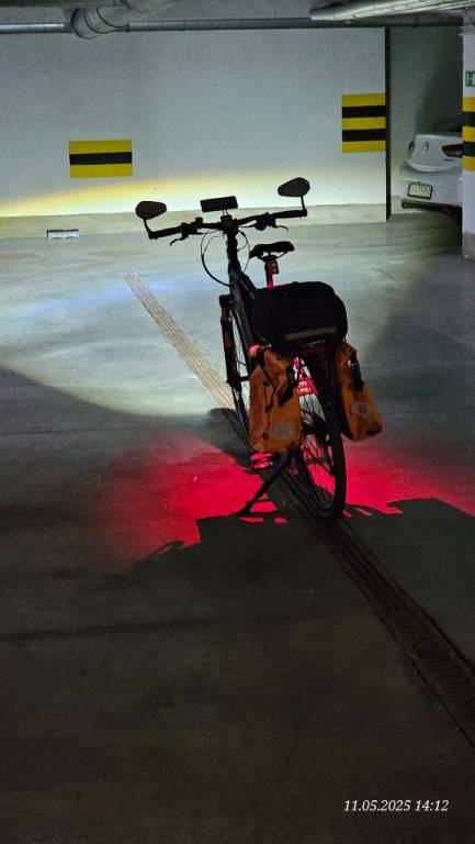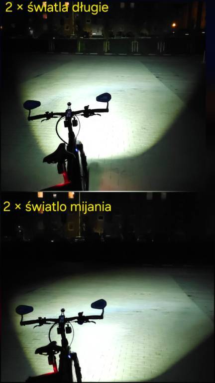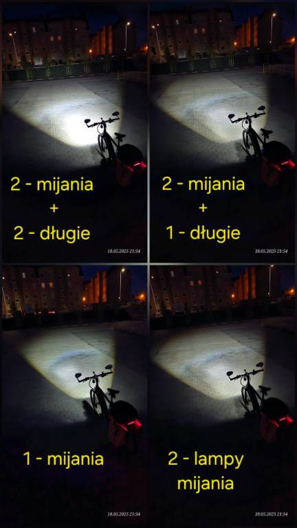 Burza1234 Opublikowano 19 Maja 2025 Opublikowano 19 Maja 2025 (edytowane) Dokupiłem drugą lampkę Magicshine EVO 1700. Różnica w świeceniu zauważalna. Tak jak pisałem wcześniej, delikatnie wygiąłem uchwyt tak aby swiatlo miało większy promień. Do zestawu dokupilem przewód od długości 3 metrów, USB A + 2×USB C ,który połączy POWERBANK z lampkami. Zrobiłem zdjecia lecz one nie oddają tego co oczy widzą. Teren jaki wybrałem to parking CH , który nie był oświetlony przez lampy uliczne. Edytowane 19 Maja 2025 przez Burza1234