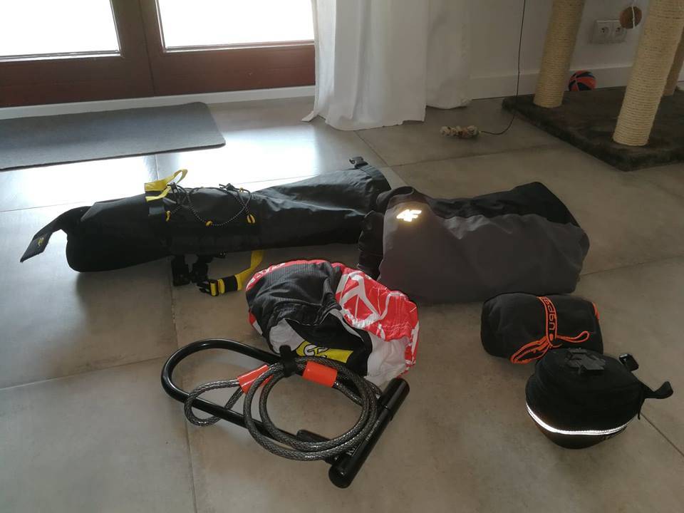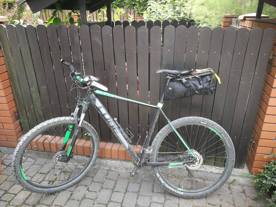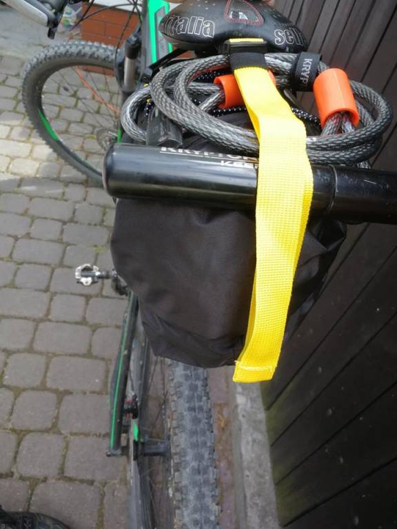 -przy większym obciążeniu (tak jak u mnie) warto zastanowić się nad dołożeniem gumy podtrzymującej od dołu i przepuszczonej przez pręty siodełka. Powinno to także ustabilizować cały ładunek. Przy czym ładunek był nieco mniejszy gabarytowo niż przy testach-nie wziąłem kurtki, a wziąłem kąpielówki, rękawki, powerbank.