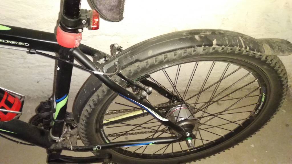 Rozwiązaniem było bo dobrać błotnik cienki pod hamulcem, albo hamulce z dłuższymi ramionami aby linia przebiegu linki hamulca był wyżej niż obecnie.